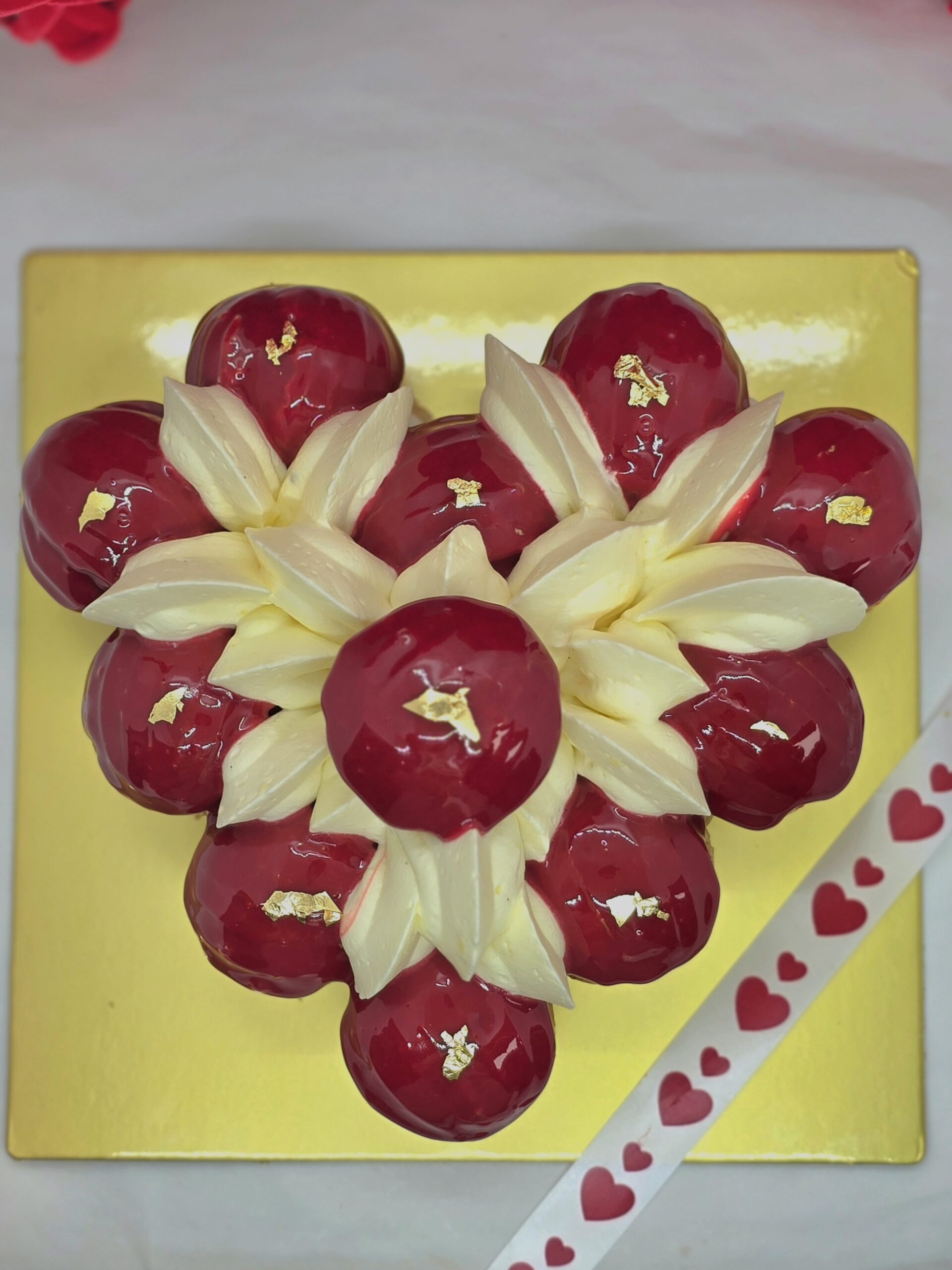 This delicately designed heart-shaped cake is a culinary masterpiece. Layers of buttery puff pastry meet silky smooth cream, delivering a melt-in-your-mouth experience in every bite. Adorned with a light caramel glaze and intricate piping, the cake’s aesthetics are as delightful as its taste—captivating your Valentine at first sight.